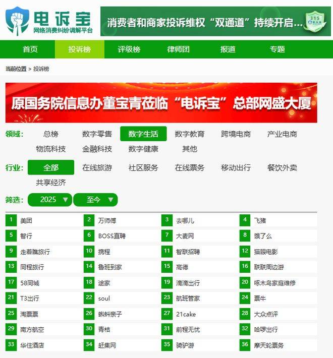 据网络消费纠纷调解平台“电诉宝”美团、万师傅、去哪儿、飞猪、智行、BOSS直聘、大麦网、饿了么、走着瞧旅行、携程、智联招聘、猫眼电影、同程旅行、鲁班到家、高德、联联周边游、58同城、途家、滴滴出行、啄木鸟家庭维修、T3出行、soul、航班管家、票牛、淘票票、蝌蚪亲子、21cake、大众点评、南方航空、青桔、前程无忧、哈啰出行、华住酒店、赶集网、骑驴游、摩天轮票务。