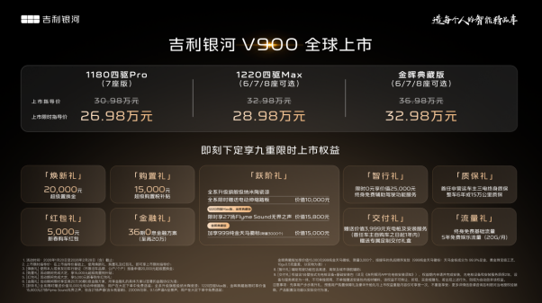 1月20日,吉利银河豪华V系列首发之作,“AI全场景家庭旗舰MPV”——吉利银河V900正式上市,共推出3个车型,上市限时指导价26.98万元-32.98万元。即日起,用户可通过吉利银河APP、微信小程序、抖音小程序及官网等官方渠道下订,下订即享焕新礼、购置礼、红包礼、金融礼、智行礼、质保礼、交付礼、流量礼、跃阶礼九重购车好礼,超高价值,一次满足,诚意拉满。