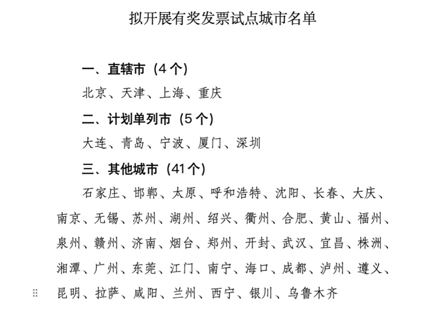三部门发文表示,支持50个左右城市开展试点工作,主要向人口基数大、带动作用强、发展潜力好的城市倾斜,同时兼顾地区间政策平衡。政策实施期为6个月。试点城市对个人消费者以本人名义向零售、餐饮、住宿、文化艺术、娱乐、旅游、体育、居民服务业等行业的经营主体购买商品和服务,且取得的票面金额在一定额度以上的发票组织抽奖。试点城市自行确定中奖发票最低票面额度(不低于100元)、中奖比例和奖项设置,及时兑付补贴资金。单张发票奖项金额原则上不超过800元。 支持50个左右城市开展试点工作,主要向人口基数大、带动作用强、发展潜力好的城市倾斜,同时兼顾地区间政策平衡。政策实施期为6个。