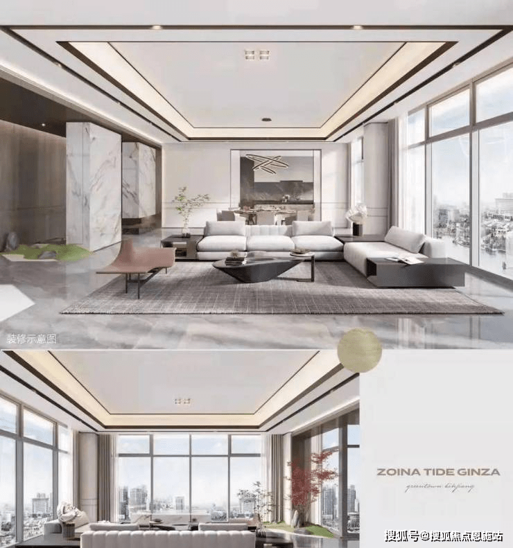 室内基本都用全景落地长窗,三个采光面加起来竟有约54米,相当于窗外有“2.5个IMAX屏幕”那么长的风景。再搭配标准层约4.19米的层高,空间感霸气无匹。