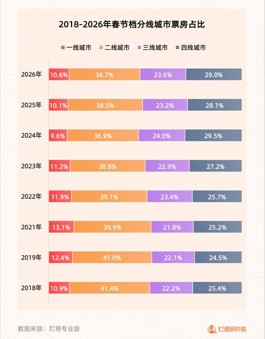 数据显示,2023-2025年春节档女性观众占比都超过60%,而今年男性观众占比则出现明显增长。灯塔专业版数据分析师陈晋表示:“这一变化主要得益于《飞驰人生3》《镖人:风起大漠》等影片的热映,有效拉动了男性观众的观影热情,使得今年春节档电影市场的男女比例更加均衡。”