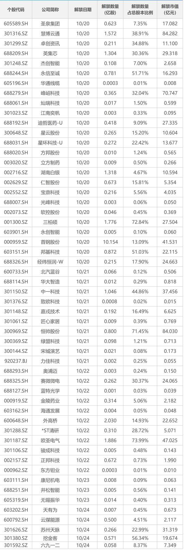 收盘价计算,合计解禁市值约725亿元。其中,解禁市值居前三位的是:慧博云通(84.28亿元)、恒帅股份(84.03亿元)、峰岹科技(70.75亿元)。从个股的解禁量看,解禁股数居前三位的是:首钢股份(10.15亿股)、外高桥(2.03亿股)、欧圣电气(1.89亿股)。