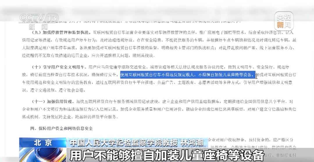 中国人民大学纪检监察学院教授林鸿潮表示,《意见》中规定,用户不能擅自加装儿童座椅等设备,共享单车仅限租赁者个人使用,私装座椅还可能面临交警的处罚。