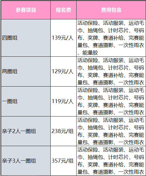 一、活动组别:男子四圈组、女子四圈组、男子两圈组、女子两圈组、男子一圈组、女子一圈组、亲子2人一圈组、亲子3人一圈组。