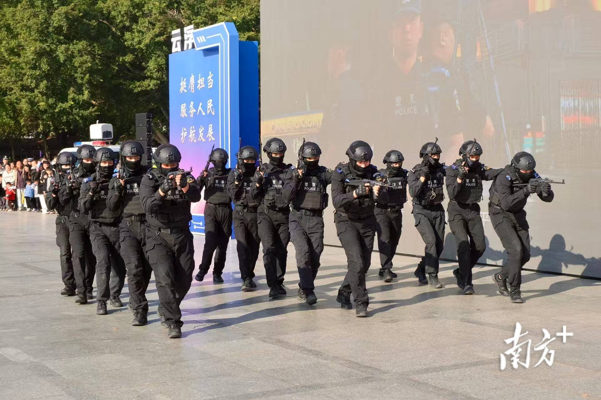 在警务技能展示环节,特警支队首先带来警棍盾牌操表演。队员们动作整齐划一、刚劲有力,展现出特警队员在实战中应对突发情况的专业能力,赢得现场阵阵掌声。随后,交警部门通过情景演示,现场模拟酒精呼气检测、讲解驾乘摩电车辆佩戴头盔的重要性、交通指挥手势及改装车危害,并邀请市民参与互动体验。市局交管支队交通指挥大队辅警梁志聪结合案例,呼吁市民共建文明交通环境。