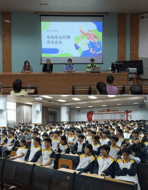 ▲蓬江交管大队走进江门市第一职业高级中学,以规范骑行电动自行车为主题,为在校学生送上一堂交通安全宣传课。