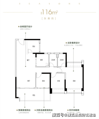 该户型分布于高楼层楼栋,2 梯 3 户低密设计,提升居住私密性与舒适度,双主卧套房配置,两个主卧均带独立卫浴,满足长辈与年轻夫妻分房居住需求,互不打扰;预留多功能空间,可改造为书房、影音室、健身房、儿童游戏室,灵活适配个性化需求;超大南向观景阳台搭配全景落地窗,直面周边山景与园林景观,采光、视野、通风均达到顶级水准。